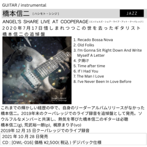 これまでの輝かしい経歴の中で、自身のリーダーアルバムリリースがなかった橋本信二。2019年末のクーパレッジでのライブ録音を追悼盤として発売。ソウルフルなメンバーと共演し、熱気を帯びた橋本信二のギターは必聴!