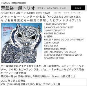 荒武裕一朗のピアノトリオ。ホール録音でのマイク1本でごまかし無しの意欲作。スタンダードとポップスに挑戦したピアノは必聴。