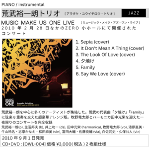 2010年2月28日なかのZERO小ホールにて開催されたコンサート。 ピアニスト荒武裕一朗を中心に多くのアーティストが集結した。荒武裕一朗の代表曲「夕焼け」「Family」に弦楽8重奏を交えた超豪華アレンジ版。牧野竜太郎とハーモニカ田中光栄を迎えた一夜限りのコンサートを完全収録。