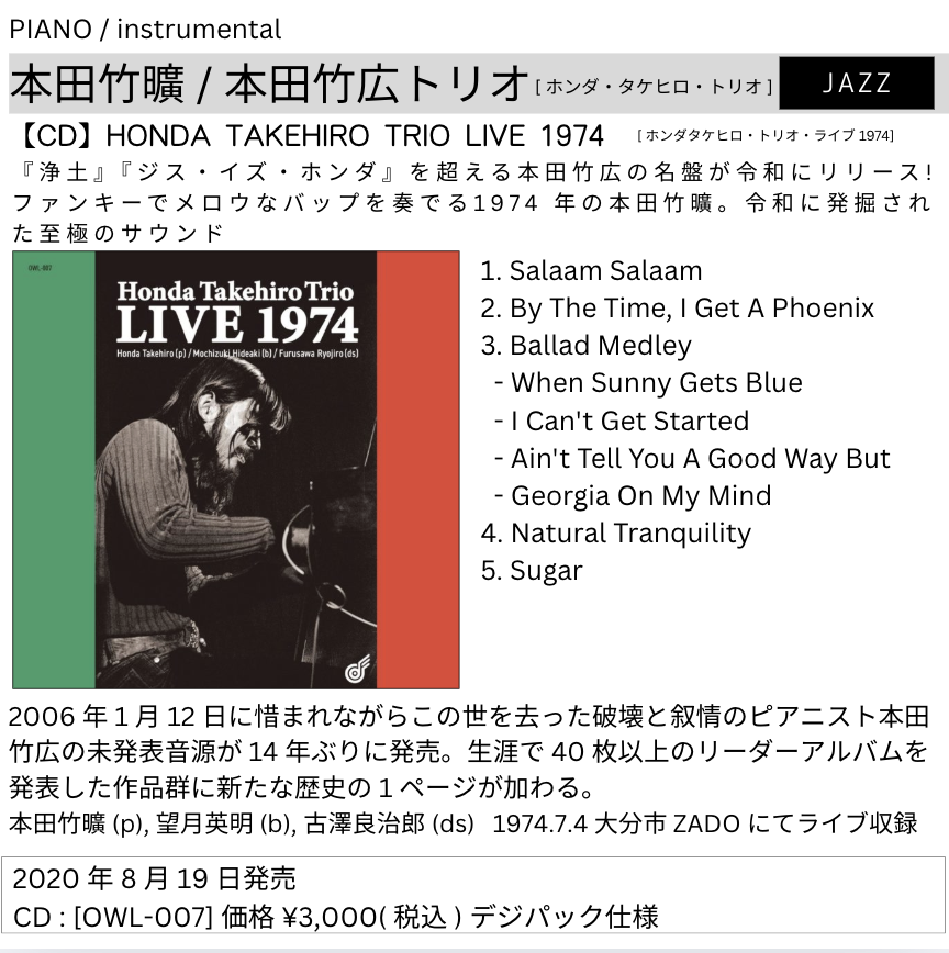 2006年1月12日に惜まれてこの世を去った破壊と叙情のピアニスト本田竹曠の未発表音源が14年ぶりに発売決定!生涯で40枚以上のリーダーアルバムを発表した作品群に新たな歴史の1ページが加わる。