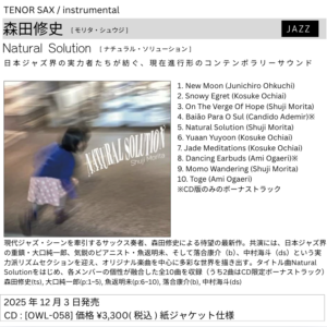現代ジャズ・シーンを牽引するサックス奏者、森田修史による待望の最新作。共演には、日本ジャズ界の重鎮・大口純一郎、気鋭のピアニスト・魚返明未、そして落合康介(b)、中村海斗(ds)という実力派リズムセクションを迎え、オリジナル楽曲を中心に多彩な世界を描き出す。タイトル曲「Natural Solution」をはじめ、各メンバーの個性が融合した全10曲を収録(うち2曲はCD限定ボーナストラック)