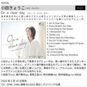 神様がくれた貴重な瞬間でした。その時私の心に急に降って来たのが、その頃歌い始めたばかりのスタンダードナンバー「On a Clear Day」でした。それは一生忘れられない瞬間になる予感がしました。時を経て2023年1月、いろいろな思いの中で私はこの1stアルバムを録音しました。